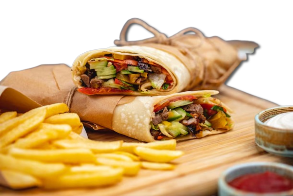 Weizen Tortilla mit saftiger Hühnchenbrust,fruchtige Salsa-Soße, Salat, rote Zwiebeln, Tomaten, rote Bohnen, Jalapenos, Mais & GoudaKäse