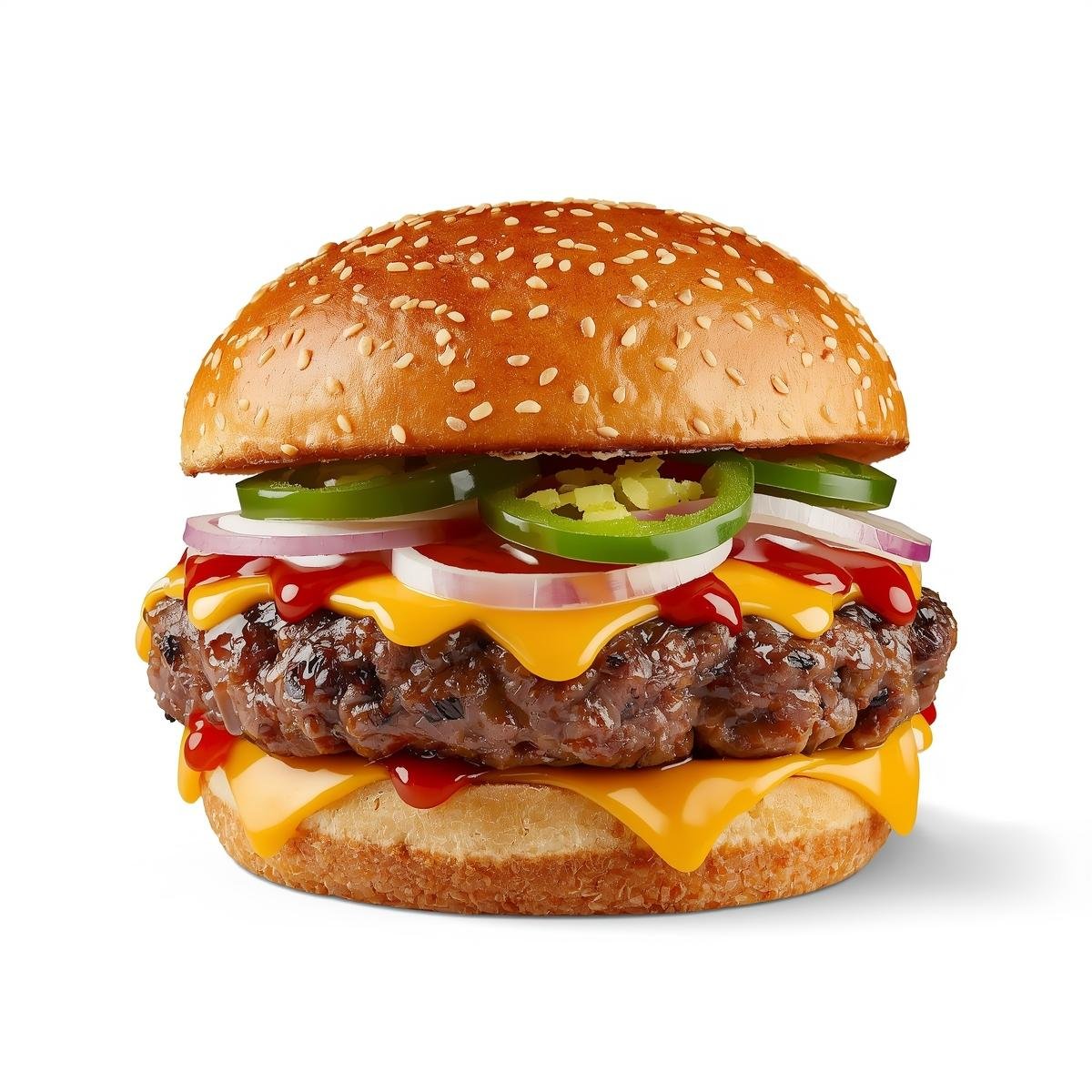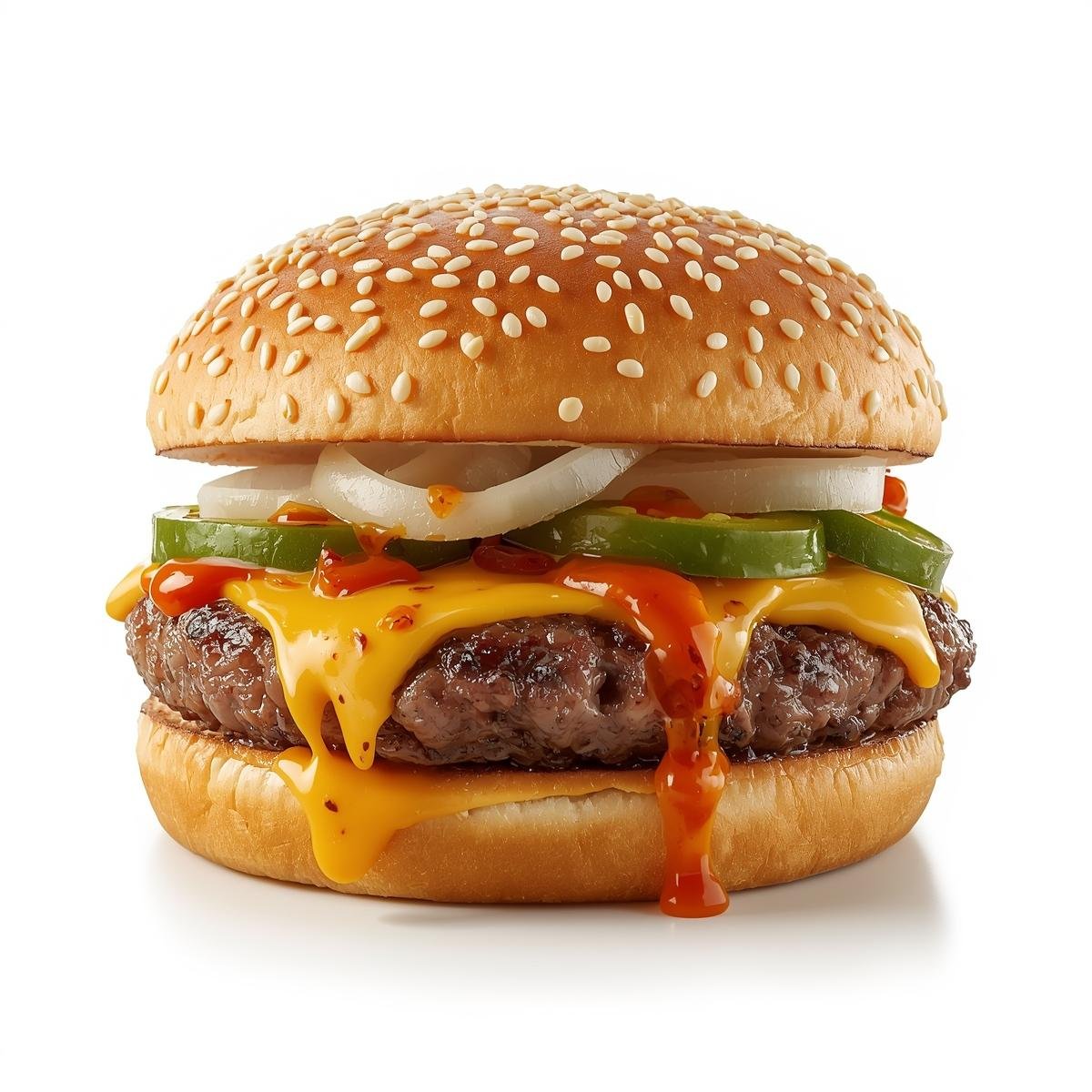 mit BBQ-Sauce, Tomaten, eingelegte Gurken,Zwiebeln, Rösti-Zwiebeln, Eisbergsalat, Jalapenos und Käse