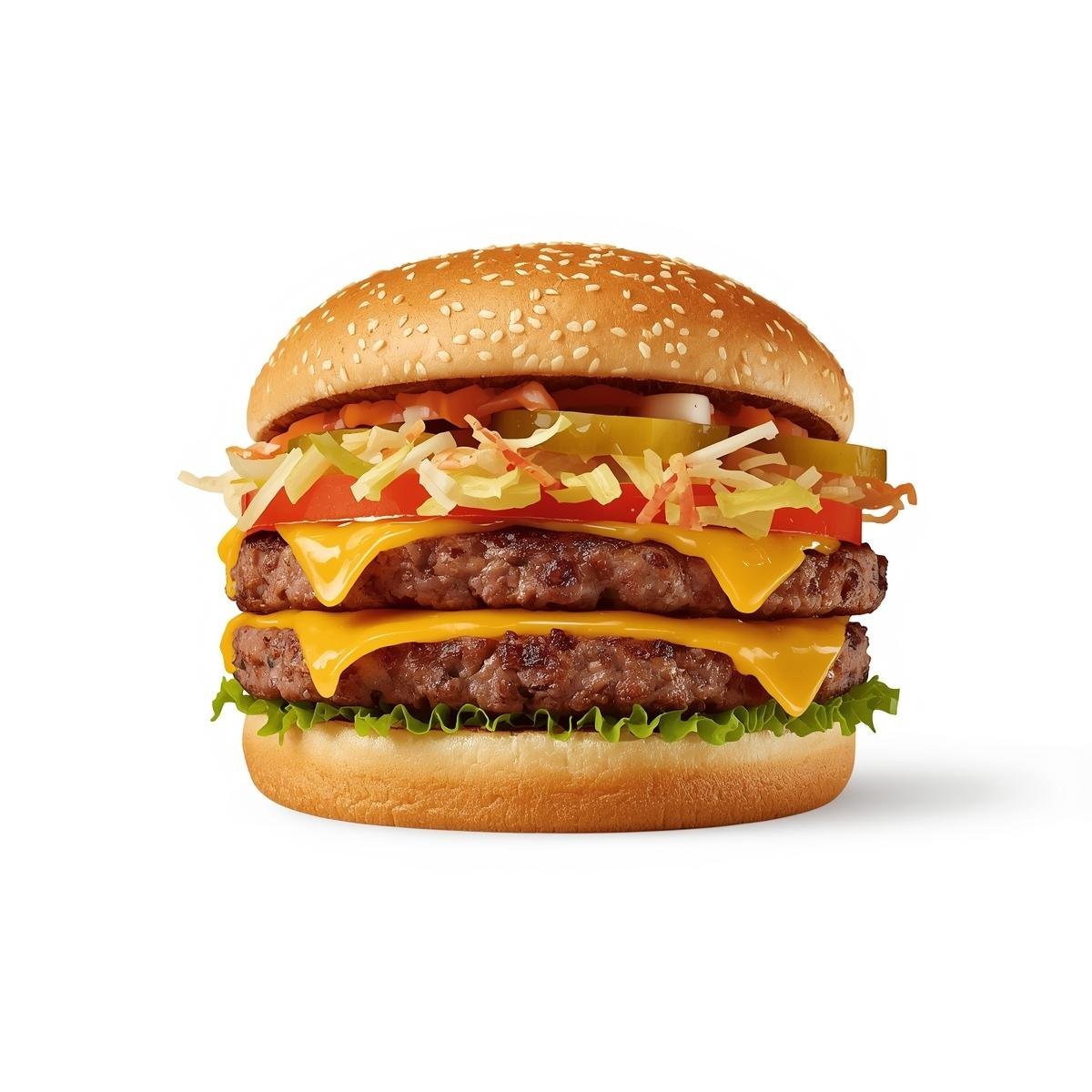Doppelt Fleisch (2x180 gr.) Salat, Tomaten, Gurken, Käse
