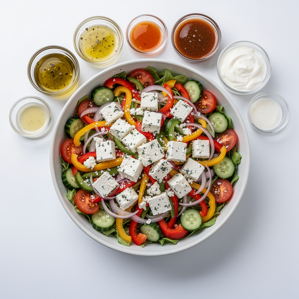 mit grünem Salat, Fetakäse, Paprika und Thunfisch
