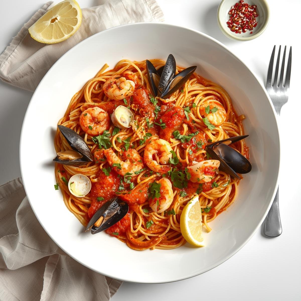 Meeresfrüchte, Knoblauch und Tomatensauce